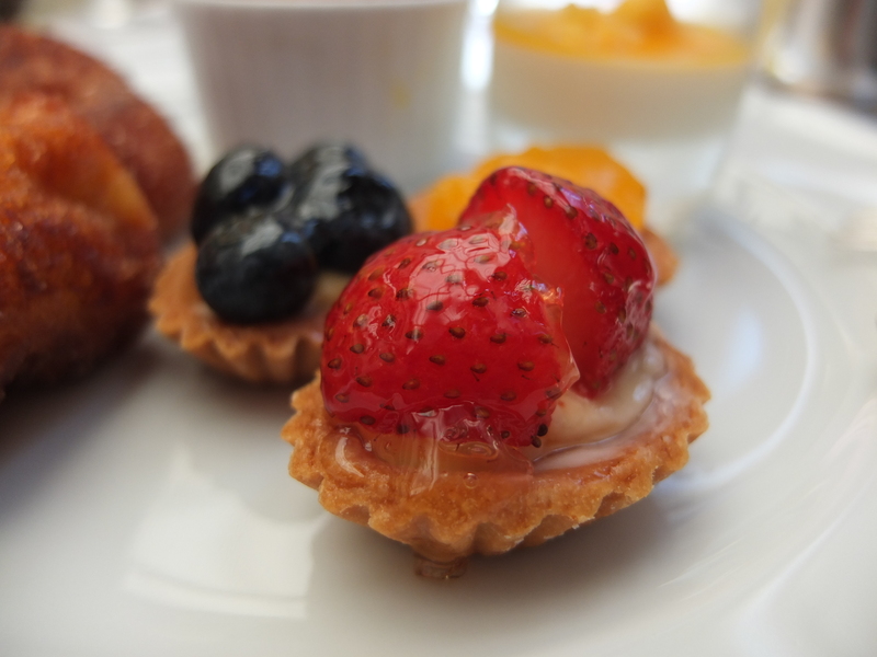 不同水果的新鮮水果塔、芒果奶酪、西班牙酥脆泡芙、焦糖烤布蕾,