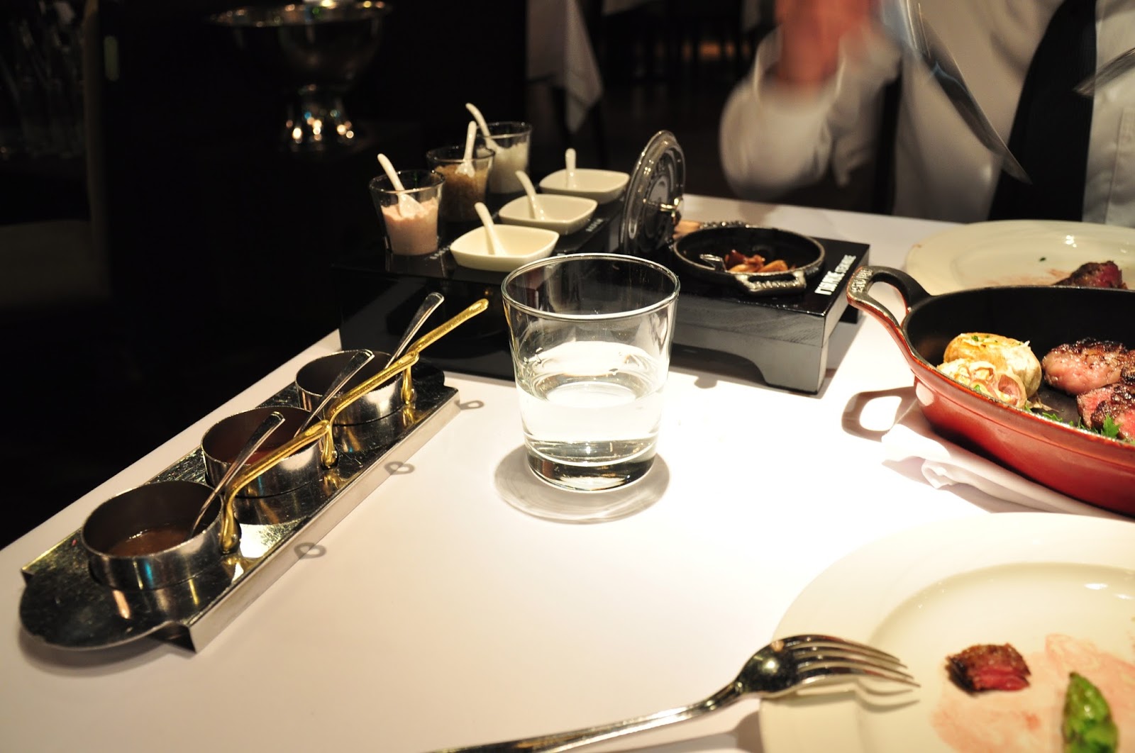 上牛排前服務生會先上醬料 有三種鹽粒、三種芥末醬、跟三種濕的沾醬